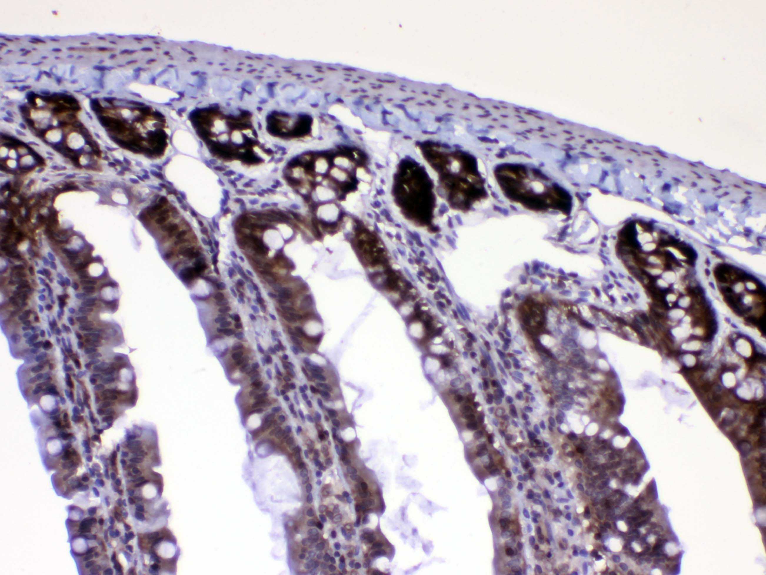 RAN was detected in a paraffin-embedded section of mouse small intestine tissue. Biotinylated goat anti-rabbit IgG was used as secondary antibody. The tissue section was incubated with rabbit anti-RAN Antibody (A00204-1) at a dilution of 1:200 and developed using Strepavidin-Biotin-Complex (SABC) (Catalog # SA1022) with DAB (Catalog # AR1027) as the chromogen.