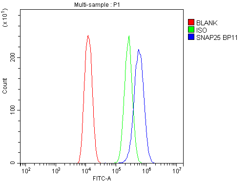 Overlay histogram showing U2OS cells stained with A01625 (Blue line). To facilitate intracellular staining, cells were fixed with 4% paraformaldehyde and permeabilized with permeabilization buffer. The cells were blocked with 10% normal goat serum. And then incubated with rabbit anti-SNAP25 Antibody (A01625) at 1:100 dilution for 30 min at 20°C. Fluoro488 conjugated goat anti-rabbit IgG (BA1127) was used as secondary antibody at 1:100 dilution for 30 minutes at 20°C. Isotype control antibody (Green line) was rabbit IgG at 1:100 dilution used under the same conditions. Unlabelled sample without incubation with primary antibody and secondary antibody (Red line) was used as a blank control.