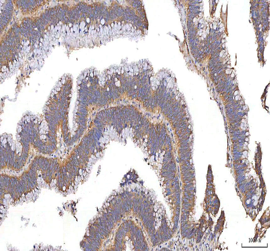 XDH was detected in a paraffin-embedded section of human colon adenocarcinoma tissue. The tissue section was developed using HRP Conjugated Rabbit IgG Super Vision Assay Kit (Catalog # SV0002) with DAB (Catalog # AR1027) as the chromogen.