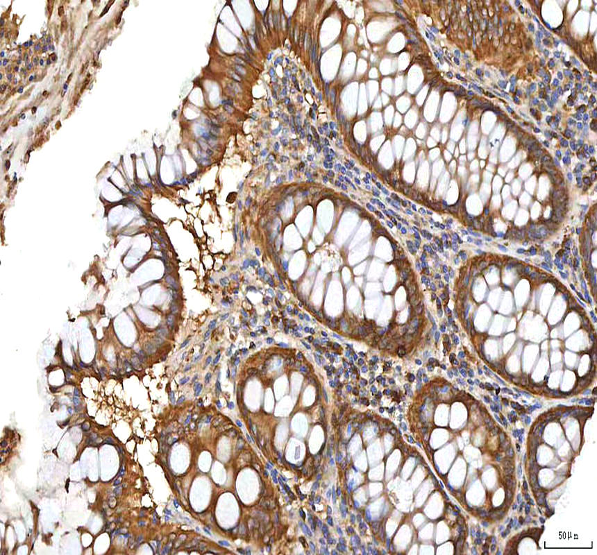 XDH was detected in a paraffin-embedded section of human colon tissue. The tissue section was developed using HRP Conjugated Rabbit IgG Super Vision Assay Kit (Catalog # SV0002) with DAB (Catalog # AR1027) as the chromogen.