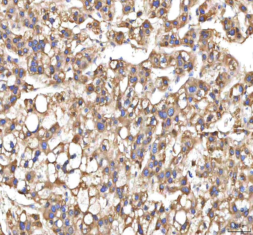 XDH was detected in a paraffin-embedded section of human liver cancer tissue. The tissue section was developed using HRP Conjugated Rabbit IgG Super Vision Assay Kit (Catalog # SV0002) with DAB (Catalog # AR1027) as the chromogen.