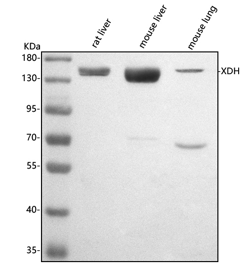 Western blot analysis of anti-XDH antibody (A01884-2). The sample well of each lane was loaded with 30 ug of sample under reducing conditions.
