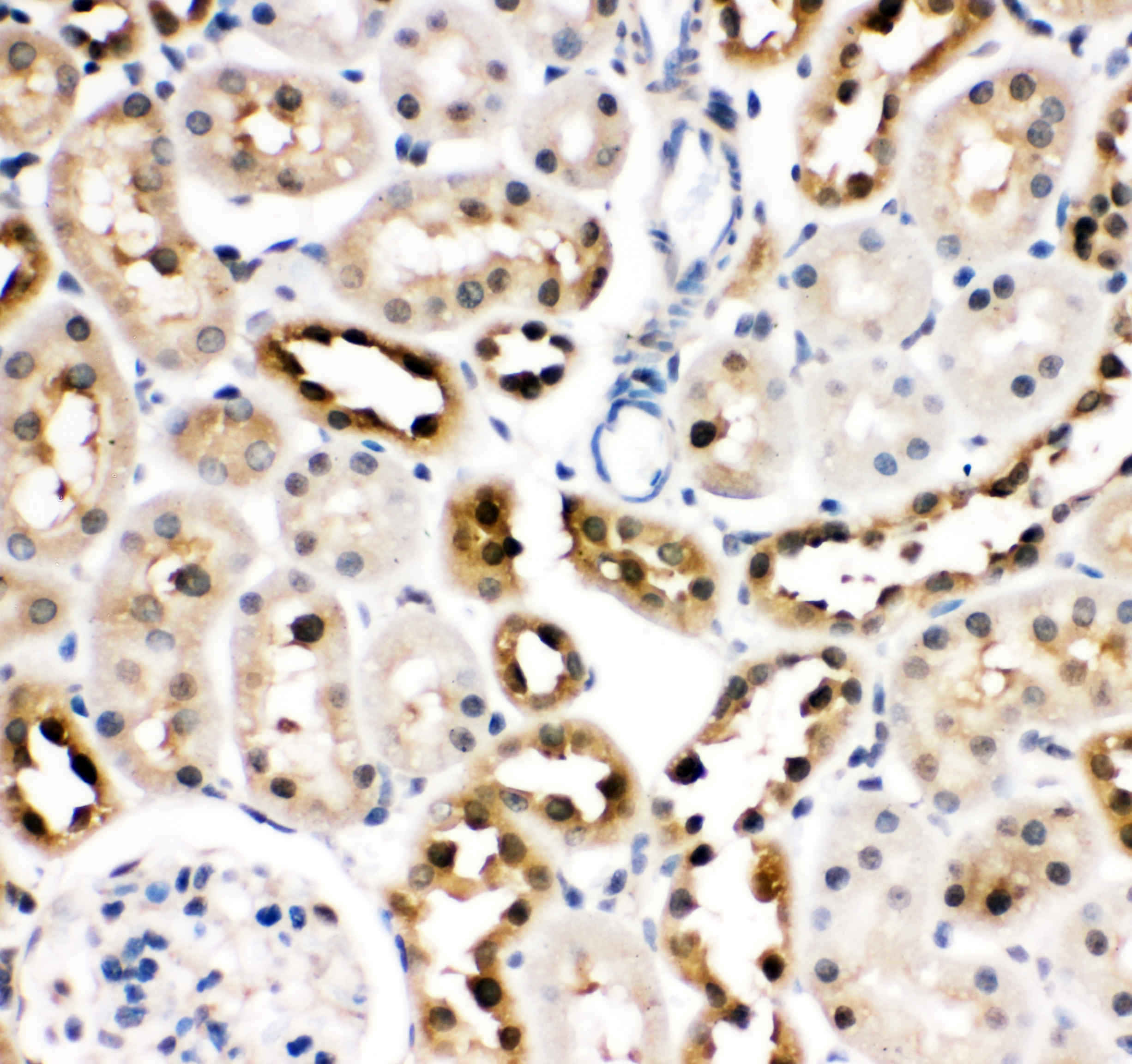 HSC70/HSPA8 was detected in a paraffin-embedded section of rat kidney tissue. Biotinylated goat anti-rabbit IgG was used as secondary antibody. The tissue section was incubated with rabbit anti-HSC70/HSPA8 Antibody (BA2411) at a dilution of 1:200 and developed using Strepavidin-Biotin-Complex (SABC) (Catalog # SA1022) with DAB (Catalog # AR1027) as the chromogen.