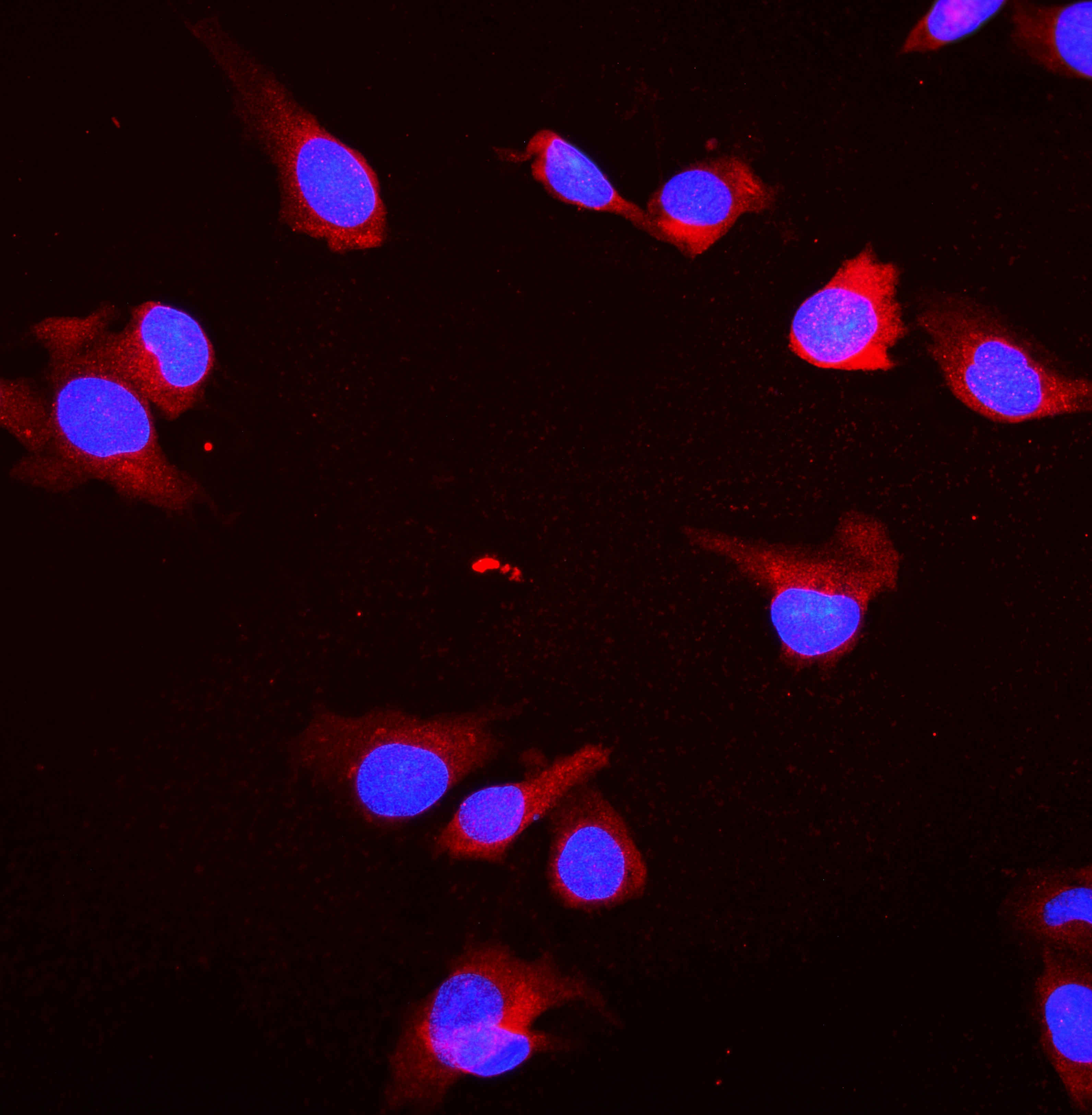 HSC70/HSPA8 was detected in an immunocytochemical section of U2OS cells. The section was incubated with rabbit anti-HSC70/HSPA8 Antibody (BA2411) at a dilution of 1:100. Fluoro594-conjugated Anti-rabbit IgG Secondary Antibody (red)(Catalog#BA1142) was used as secondary antibody. The section was counterstained with DAPI (Catalog # AR1176) (Blue).