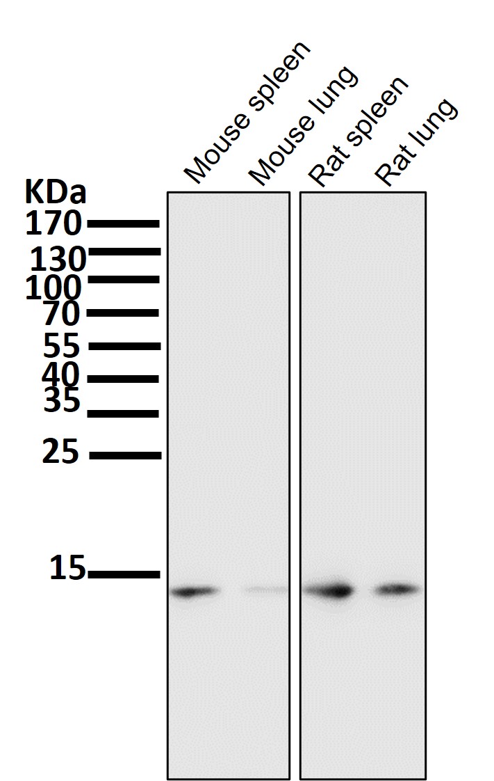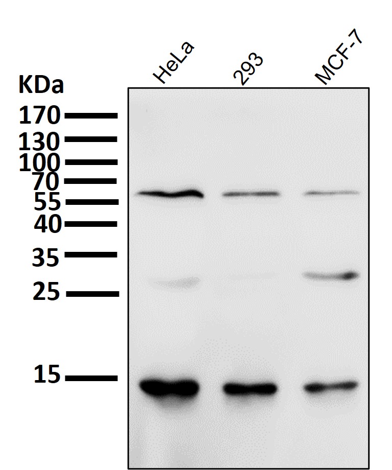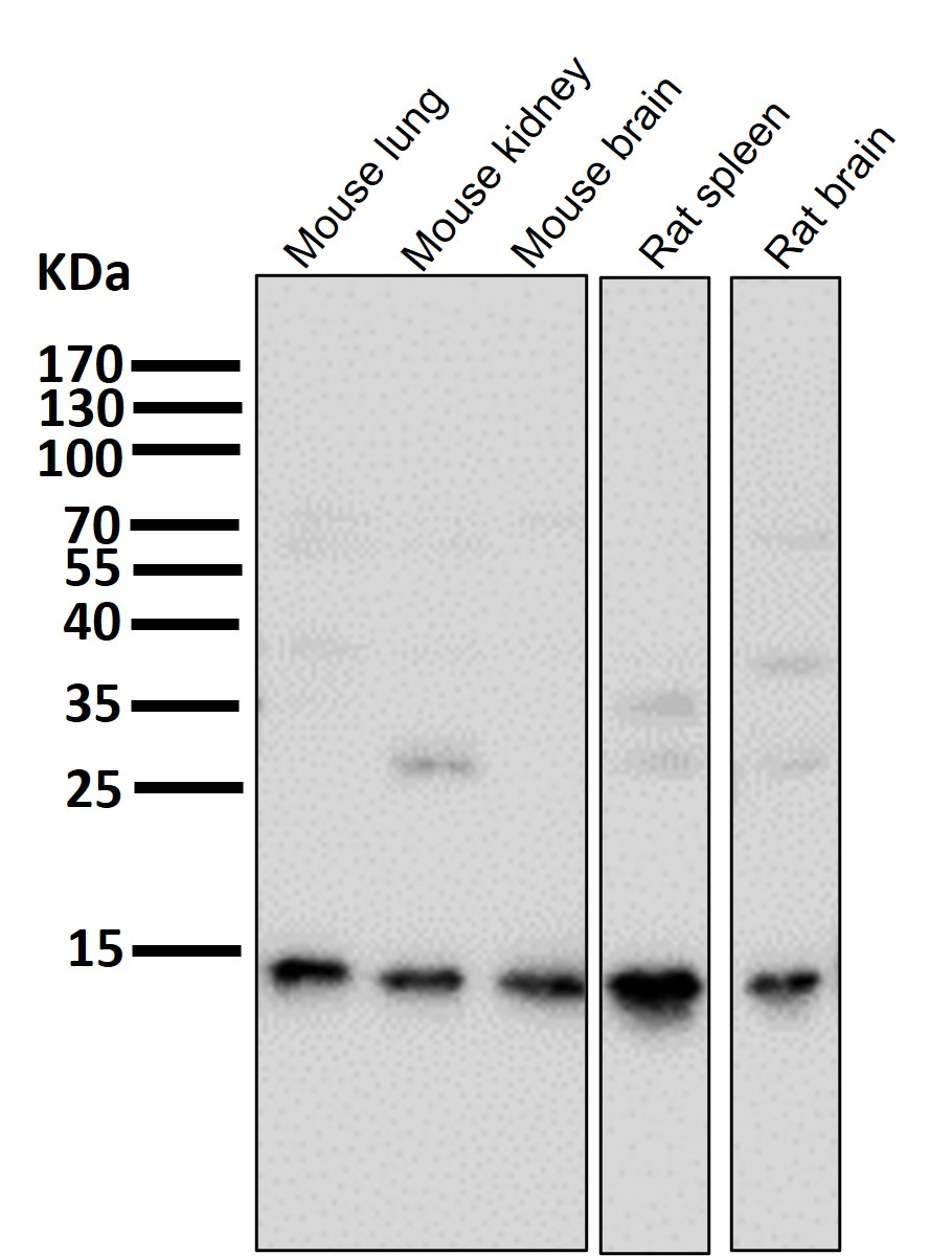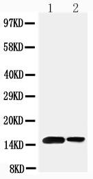 Western blot analysis of SUMO1 expression in (1) HeLa cell lysate; (2) NIH/3T3 cell lysate.