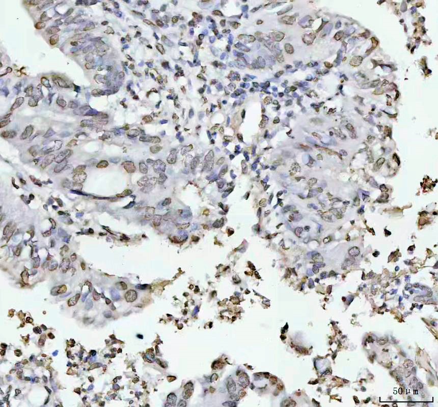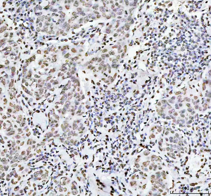 Histone H4 was detected in a paraffin-embedded section of human lung squamous cell carcinoma tissue. The tissue section was incubated with rabbit anti-Histone H4 Antibody (BM4713) at a dilution of 1:200 and developed using HRP Conjugated Rabbit IgG Super Vision Assay Kit (Catalog # SV0002) with DAB (Catalog # AR1027) as the chromogen