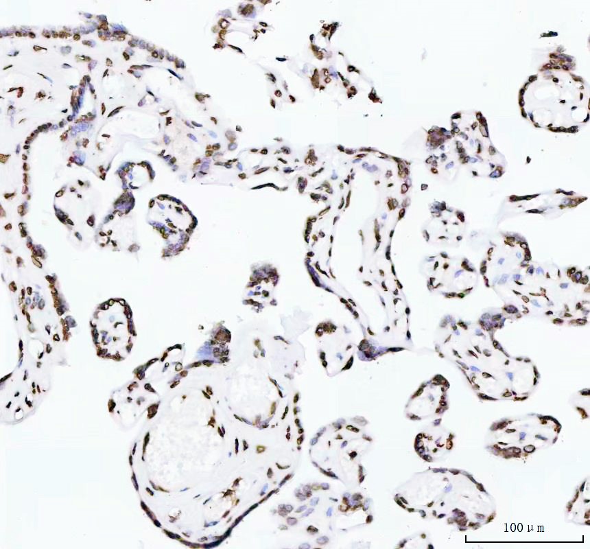 Histone H4 was detected in a paraffin-embedded section of human placenta tissue. The tissue section was incubated with rabbit anti-Histone H4 Antibody (BM4713) at a dilution of 1:200 and developed using HRP Conjugated Rabbit IgG Super Vision Assay Kit (Catalog # SV0002) with DAB (Catalog # AR1027) as the chromogen.