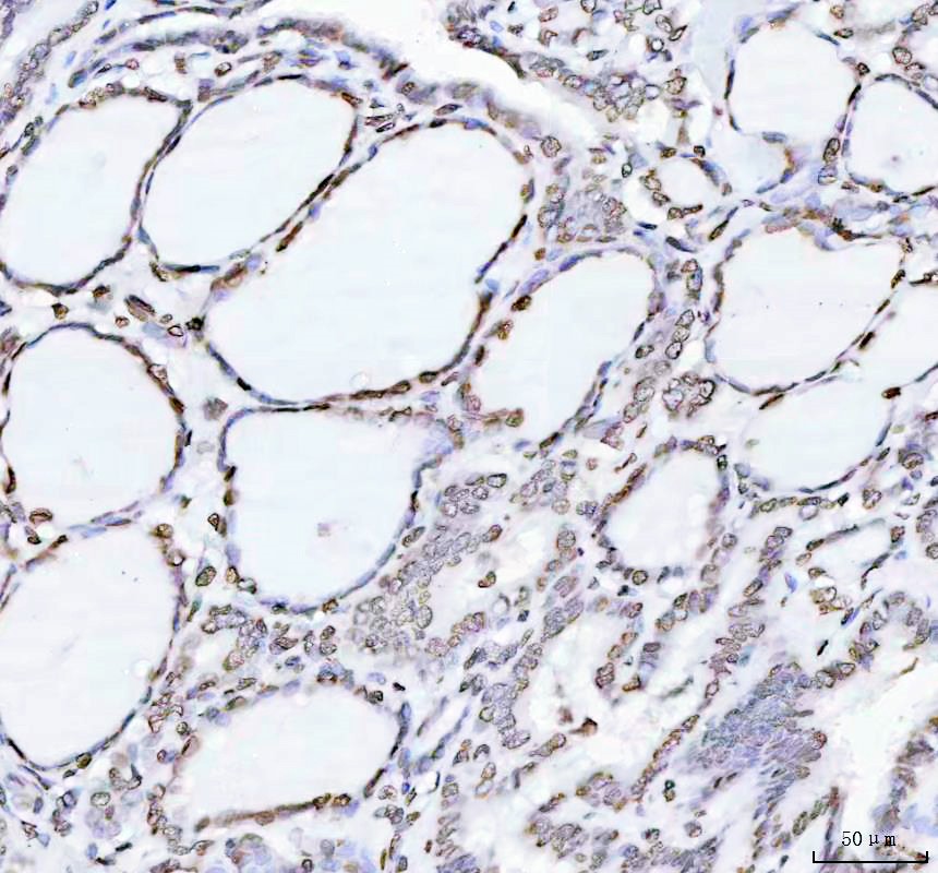 Histone H4 was detected in a paraffin-embedded section of human thyroid cancer tissue. The tissue section was incubated with rabbit anti-Histone H4 Antibody (BM4713) at a dilution of 1:200 and developed using HRP Conjugated Rabbit IgG Super Vision Assay Kit (Catalog # SV0002) with DAB (Catalog # AR1027) as the chromogen.