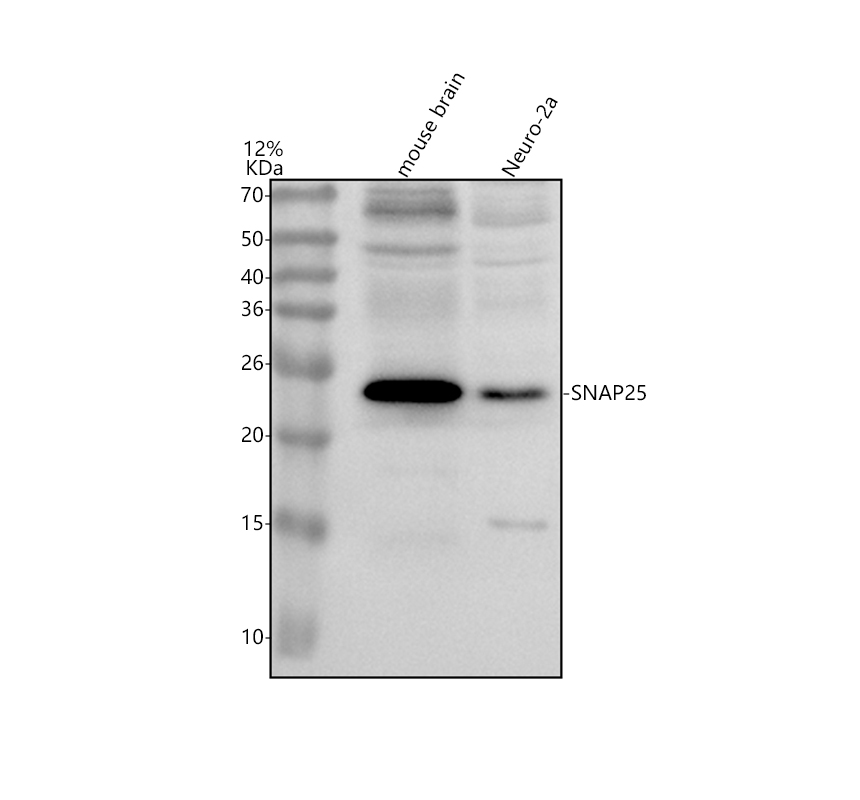 Western blot analysis of anti-SNAP25 antibody (BM5167). The sample well of each lane was loaded with 30 ug of sample under reducing conditions.