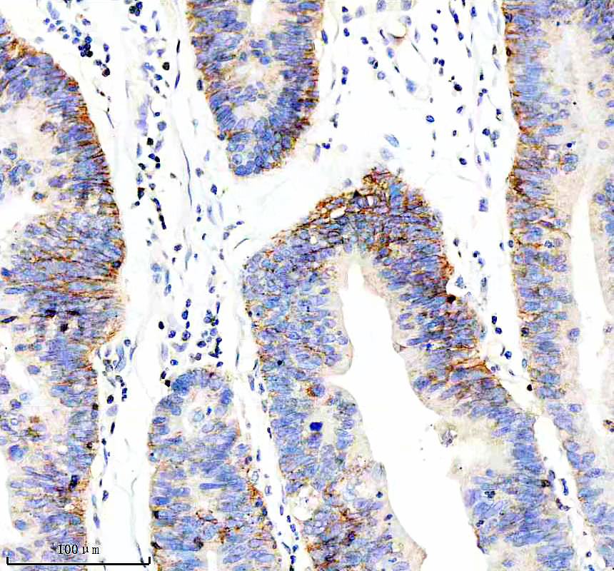 PRKCH was detected in a paraffin-embedded section of human stomach cancer tissue. The tissue section was incubated with rabbit anti-PRKCH Antibody (BM5367) at a dilution of 1:200 and developed using HRP Conjugated Rabbit IgG Super Vision Assay Kit (Catalog # SV0002) with DAB (Catalog # AR1027) as the chromogen.