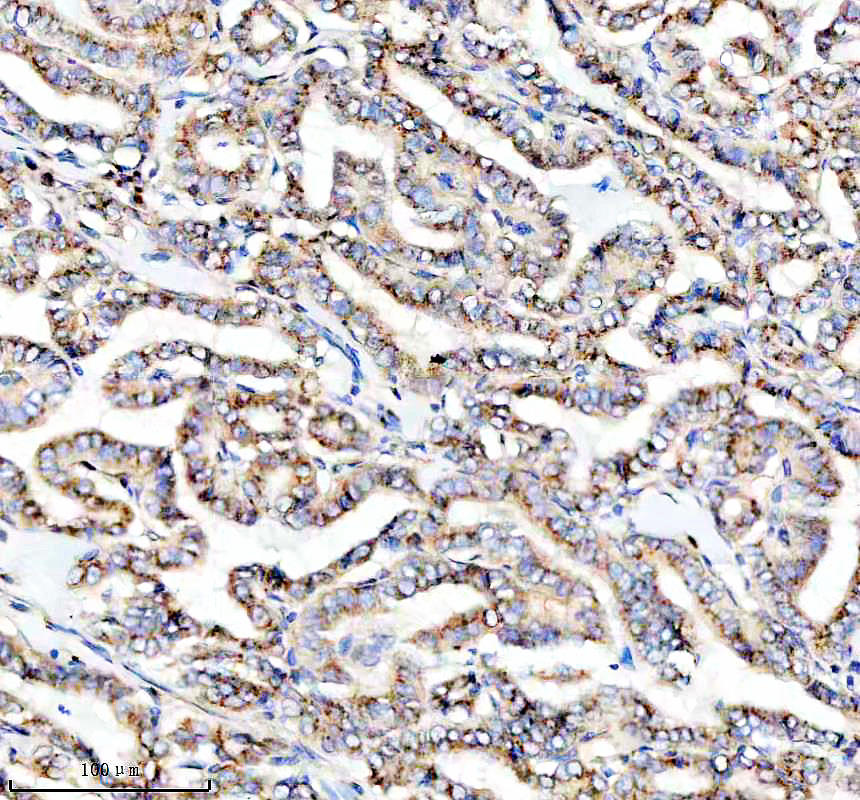 PRKCH was detected in a paraffin-embedded section of human thyroid cancer tissue. The tissue section was incubated with rabbit anti-PRKCH Antibody (BM5367) at a dilution of 1:200 and developed using HRP Conjugated Rabbit IgG Super Vision Assay Kit (Catalog # SV0002) with DAB (Catalog # AR1027) as the chromogen.