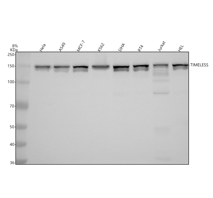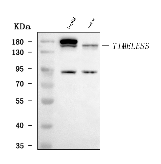 After electrophoresis, proteins were transferred to a membrane. Then the membrane was incubated with rabbit anti-TIMELESS antigen affinity purified monoclonal antibody (M00831) at a dilution of 1:1000 and probed with a goat anti-rabbit IgG-HRP secondary antibody (Catalog # BA1054). The signal is developed using ECL Plus Western Blotting Substrate (Catalog # AR1197). A specific band was detected for TIMELESS at approximately 150 kDa. The expected band size for TIMELESS is at 138 kDa.