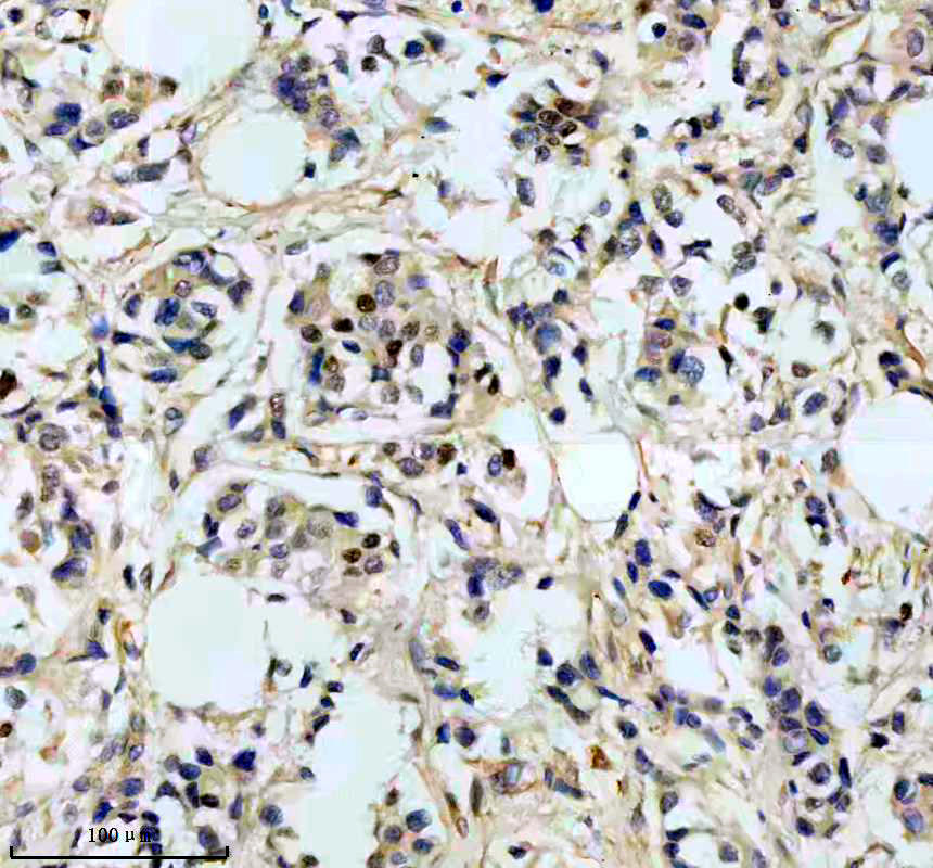 TIMELESS was detected in a paraffin-embedded section of human breast cancer tissue. The tissue section was incubated with rabbit anti-TIMELESS Antibody (M00831) at a dilution of 1:200 and developed using HRP Conjugated Rabbit IgG Super Vision Assay Kit (Catalog # SV0002) with DAB (Catalog # AR1027) as the chromogen.