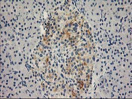 Immunohistochemical staining of paraffin-embedded Human pancreas tissue within the normal limits using anti-SNAP25 mouse monoclonal antibody. (Heat-induced epitope retrieval by 10mM citric buffer, pH6.0, 100°C for 10min, M01625-2)