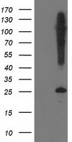 HEK293T cells were transfected with the pCMV6-ENTRY control (Left lane) or pCMV6-ENTRY SNAP25 (Right lane) cDNA for 48 hrs and lysed. Equivalent amounts of cell lysates (5 ug per lane) were separated by SDS-PAGE and immunoblotted with anti-SNAP25.