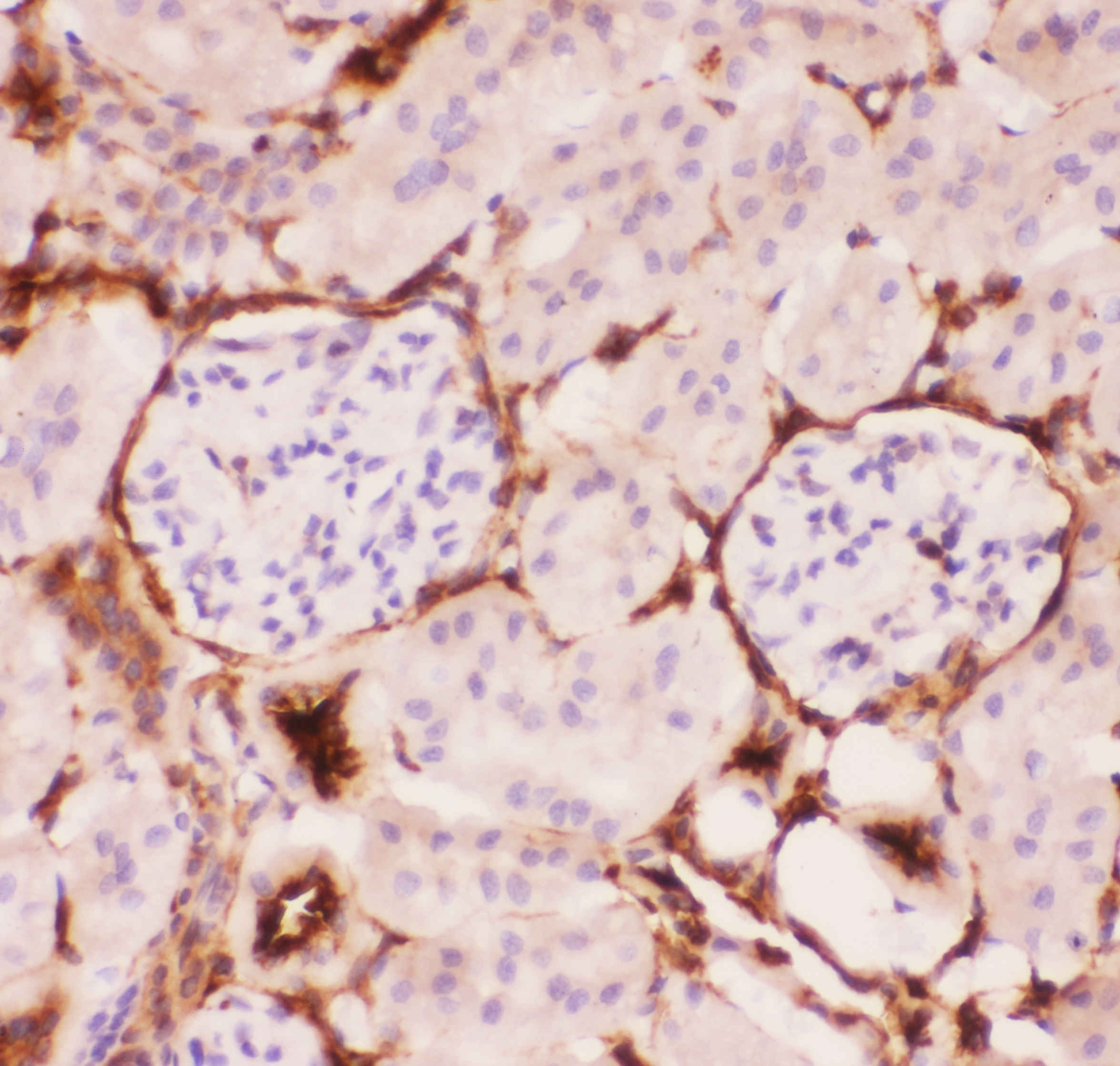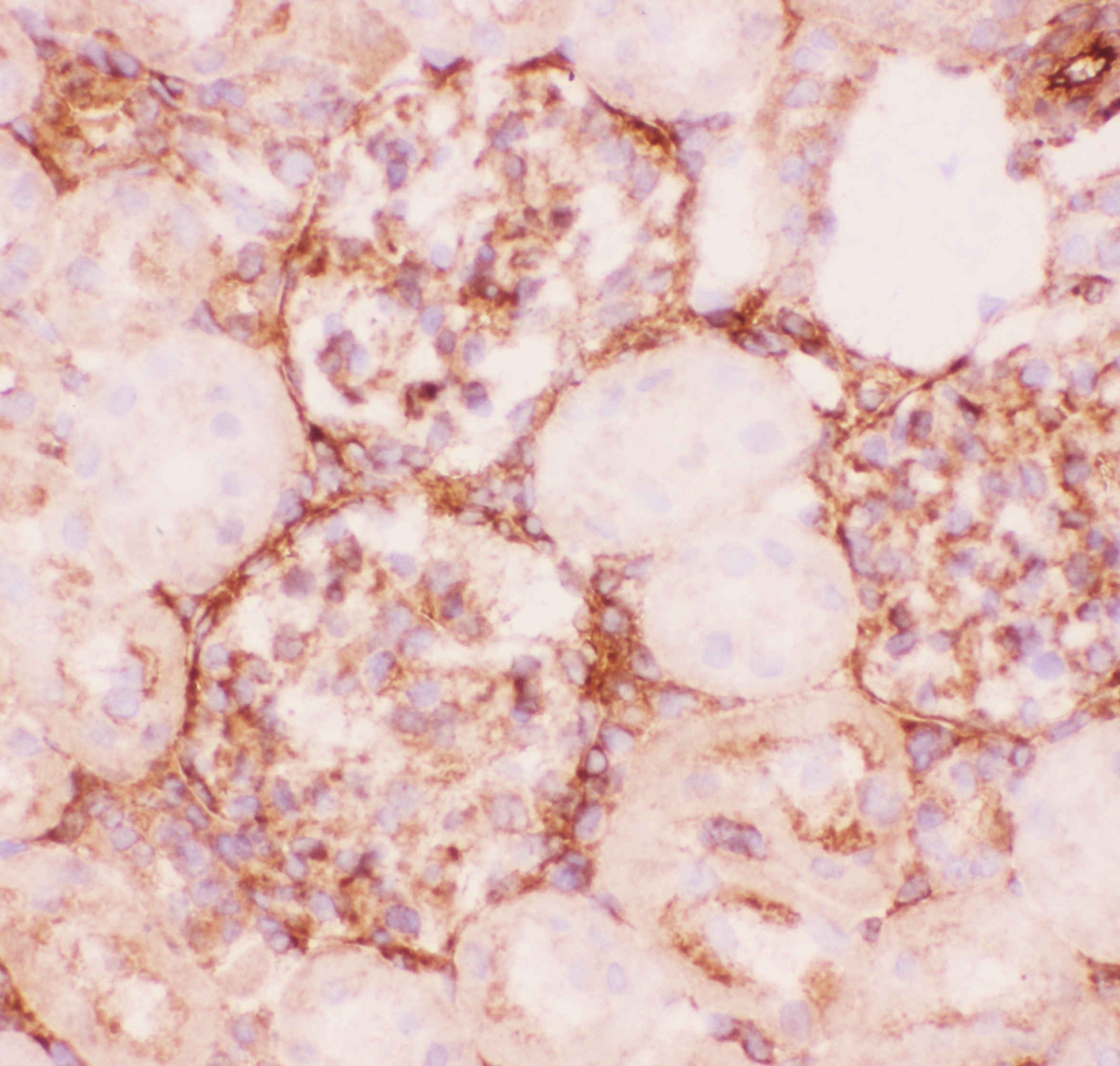 P glycoprotein/ABCB1 was detected in a paraffin-embedded section of mouse kidney tissue. The tissue section was incubated with rabbit anti-P glycoprotein/ABCB1 Antibody (PB0162) at a dilution of 1:200 and developed using HRP Conjugated Rabbit IgG Super Vision Assay Kit (Catalog # SV0002) with DAB (Catalog # AR1027) as the chromogen.