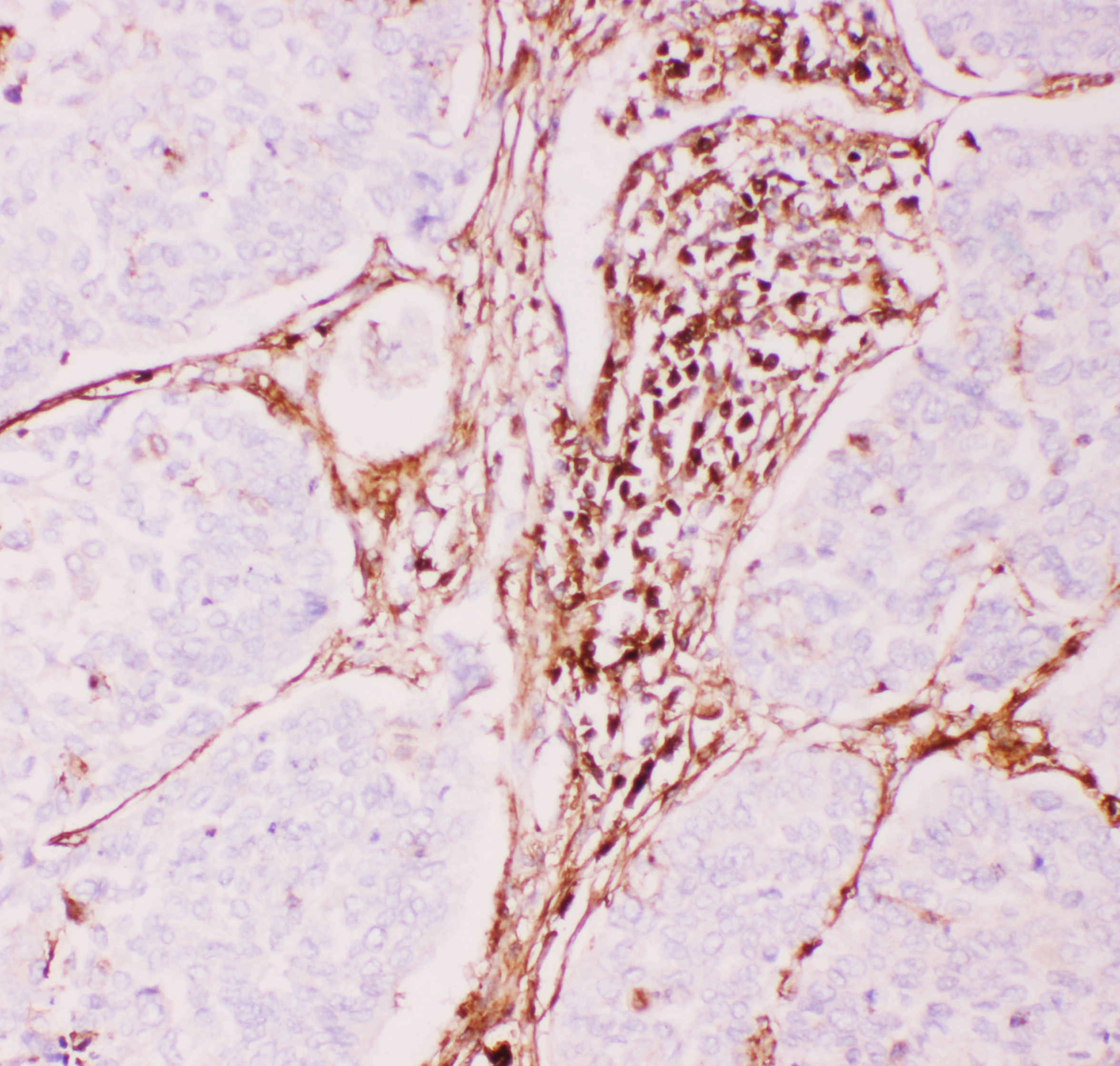 P glycoprotein/ABCB1 was detected in a paraffin-embedded section of human lung cancer tissue. The tissue section was incubated with rabbit anti-P glycoprotein/ABCB1 Antibody (PB0162) at a dilution of 1:200 and developed using HRP Conjugated Rabbit IgG Super Vision Assay Kit (Catalog # SV0002) with DAB (Catalog # AR1027) as the chromogen.