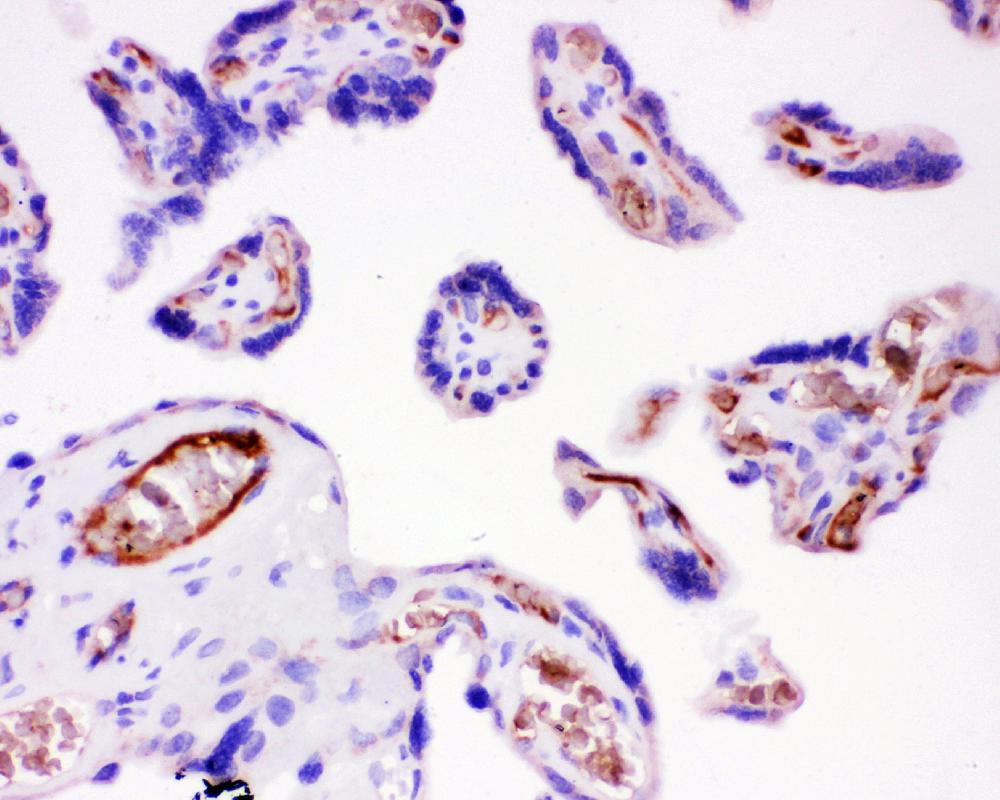 Integrin Beta 1/ITGB1 was detected in a paraffin-embedded section of human placenta tissue. Biotinylated goat anti-rabbit IgG was used as secondary antibody. The tissue section was incubated with rabbit anti-Integrin Beta 1/ITGB1 Antibody (PB9086) at a dilution of 1:200 and developed using Strepavidin-Biotin-Complex (SABC) (Catalog # SA1022) with DAB (Catalog # AR1027) as the chromogen.
