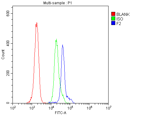 Overlay histogram showing H-PBMC cells stained with A00044 (Blue line). Fluoro488 conjugated goat anti-rabbit IgG (BA1127, 1:100) was used as secondary antibody Isotype control antibody (Green line) was rabbit IgG (1:100) used under the same conditions. Unlabelled sample (Red line) was also used as a control.