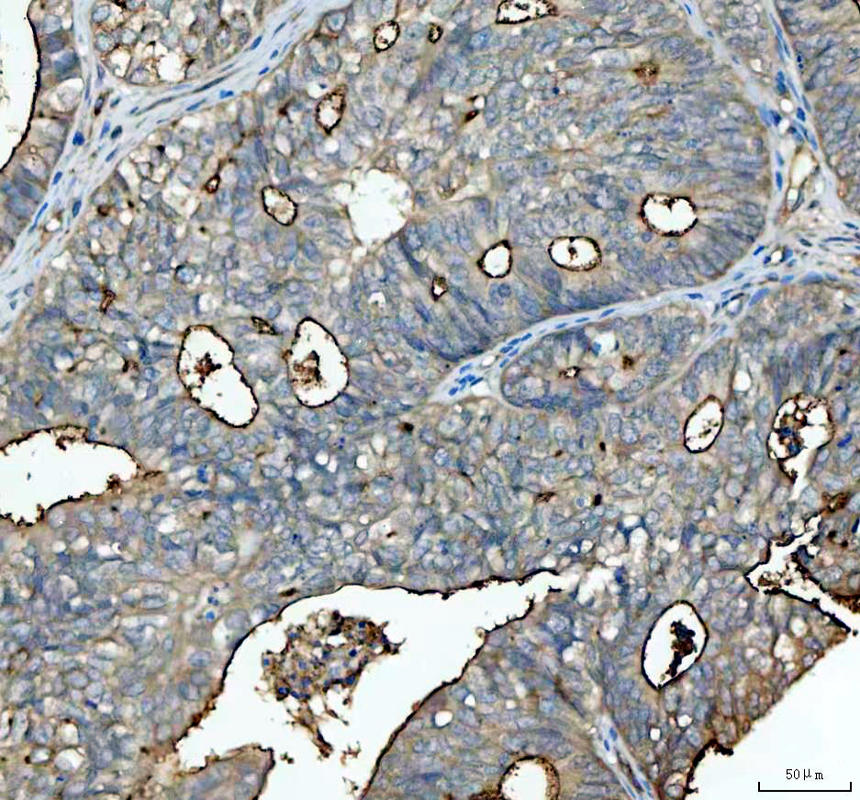 CA15-3/MUC1 was detected in a paraffin-embedded section of human endometrioid adenocarcinoma tissue. The tissue section was incubated with rabbit anti-CA15-3/MUC1 Antibody (A00187-2) at a dilution of 1:200 and developed using HRP Conjugated Rabbit IgG Super Vision Assay Kit (Catalog # SV0002) with DAB (Catalog # AR1027) as the chromogen.