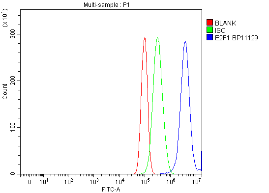 Overlay histogram showing PC-3 cells stained with A00257-2 (Blue line). To facilitate intracellular staining, cells were fixed with 4% paraformaldehyde and permeabilized with permeabilization buffer. The cells were blocked with 10% normal goat serum. And then incubated with rabbit anti-E2F1 Antibody (A00257-2) at 1:100 dilution for 30 min at 20°C. Fluoro488 conjugated goat anti-rabbit IgG (BA1127) was used as secondary antibody at 1:100 dilution for 30 minutes at 20°C. Isotype control antibody (Green line) was rabbit IgG at 1:100 dilution used under the same conditions. Unlabelled sample without incubation with primary antibody and secondary antibody (Red line) was used as a blank control.