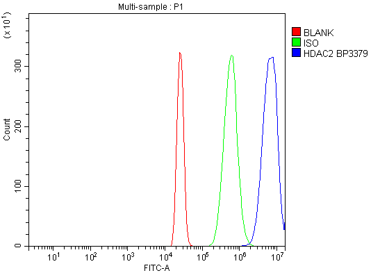 Overlay histogram showing HL-60 cells stained with A00325-3 (Blue line). To facilitate intracellular staining, cells were fixed with 4% paraformaldehyde and permeabilized with permeabilization buffer. The cells were blocked with 10% normal goat serum. And then incubated with rabbit anti-HDAC2 Antibody (A00325-3) at 1:100 dilution for 30 min at 20°C. Fluoro488 conjugated goat anti-rabbit IgG (BA1127) was used as secondary antibody at 1:100 dilution for 30 minutes at 20°C. Isotype control antibody (Green line) was rabbit IgG at 1:100 dilution used under the same conditions. Unlabelled sample without incubation with primary antibody and secondary antibody (Red line) was used as a blank control.