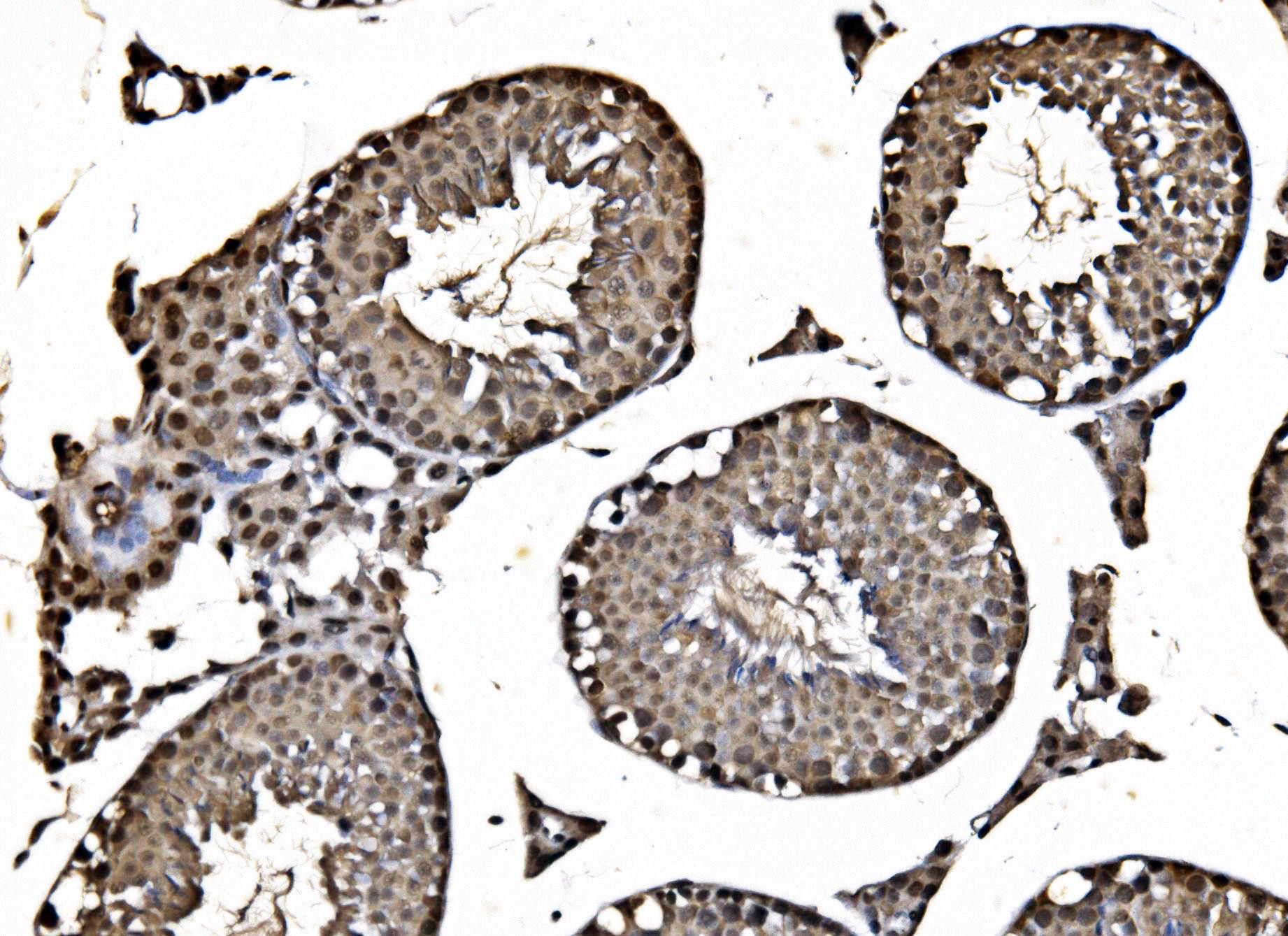 HDAC2 was detected in a paraffin-embedded section of mouse testis tissue. Biotinylated goat anti-rabbit IgG was used as secondary antibody. The tissue section was incubated with rabbit anti-HDAC2 Antibody (A00325-3) at a dilution of 1:200 and developed using Strepavidin-Biotin-Complex (SABC) (Catalog # SA1022) with DAB (Catalog # AR1027) as the chromogen.