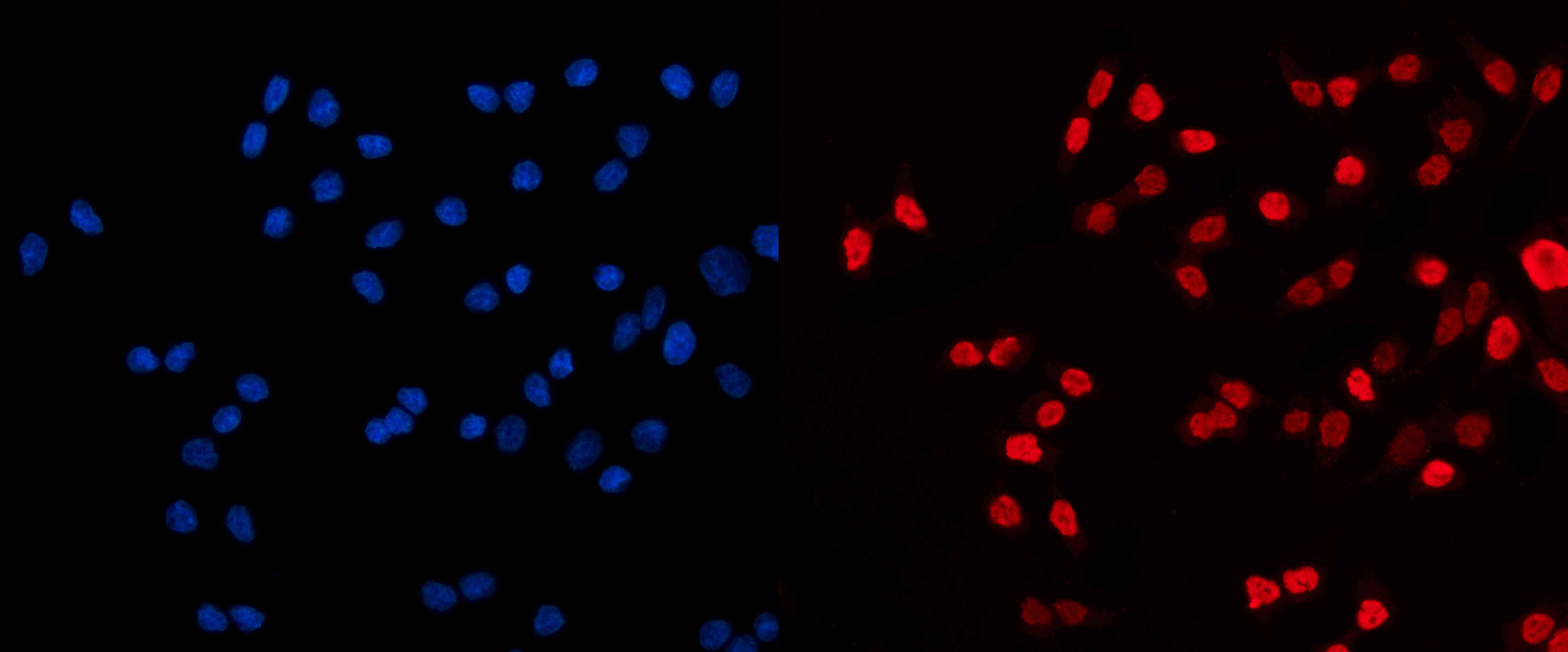 HDAC2 was detected in an immunocytochemical section of Caco-2 cells. The section was incubated with rabbit anti-HDAC2 Antibody (A00325-3) at a dilution of 1:100. Fluoro594-conjugated Anti-rabbit IgG Secondary Antibody (red)(Catalog#BA1142) was used as secondary antibody. The section was counterstained with DAPI (Catalog # AR1176) (Blue).