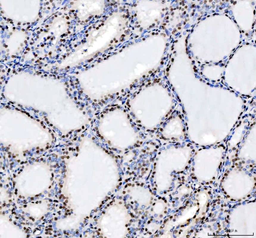 HDAC2 was detected in a paraffin-embedded section of human thyroid carcinoma tissue. Biotinylated goat anti-rabbit IgG was used as secondary antibody. The tissue section was incubated with rabbit anti-HDAC2 Antibody (A00325-3) at a dilution of 1:200 and developed using Strepavidin-Biotin-Complex (SABC) (Catalog # SA1022) with DAB (Catalog # AR1027) as the chromogen.