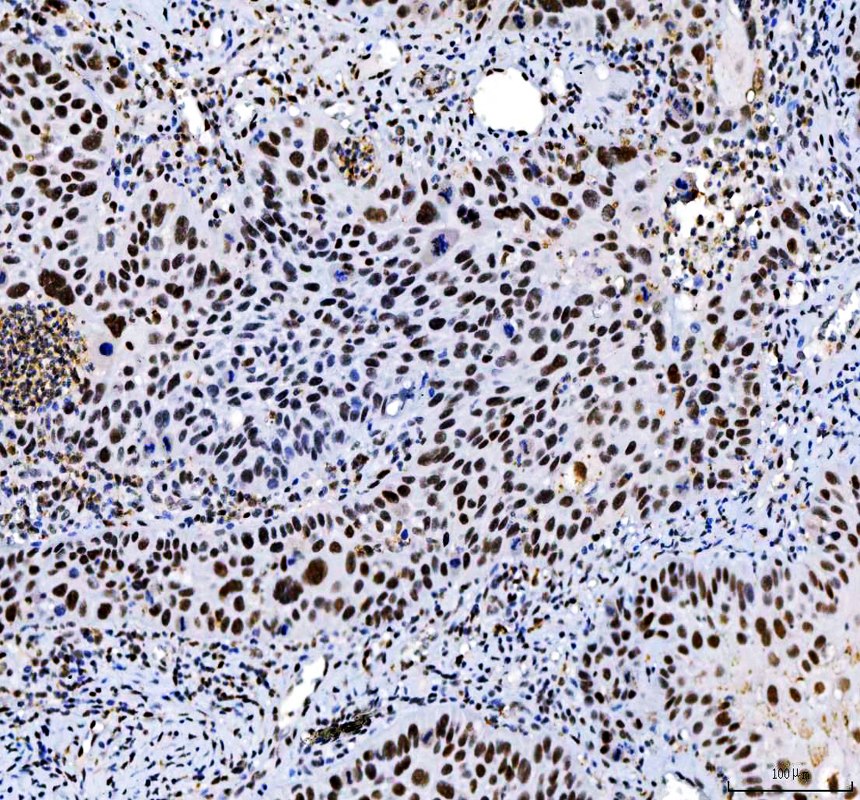HDAC2 was detected in a paraffin-embedded section of human laryngeal squamous cell carcinoma tissue. Biotinylated goat anti-rabbit IgG was used as secondary antibody. The tissue section was incubated with rabbit anti-HDAC2 Antibody (A00325-3) at a dilution of 1:200 and developed using Strepavidin-Biotin-Complex (SABC) (Catalog # SA1022) with DAB (Catalog # AR1027) as the chromogen.