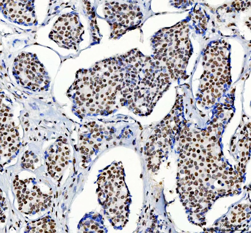 HDAC2 was detected in a paraffin-embedded section of human breast cancer tissue. Biotinylated goat anti-rabbit IgG was used as secondary antibody. The tissue section was incubated with rabbit anti-HDAC2 Antibody (A00325-3) at a dilution of 1:200 and developed using Strepavidin-Biotin-Complex (SABC) (Catalog # SA1022) with DAB (Catalog # AR1027) as the chromogen.