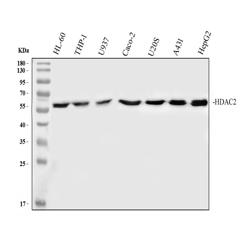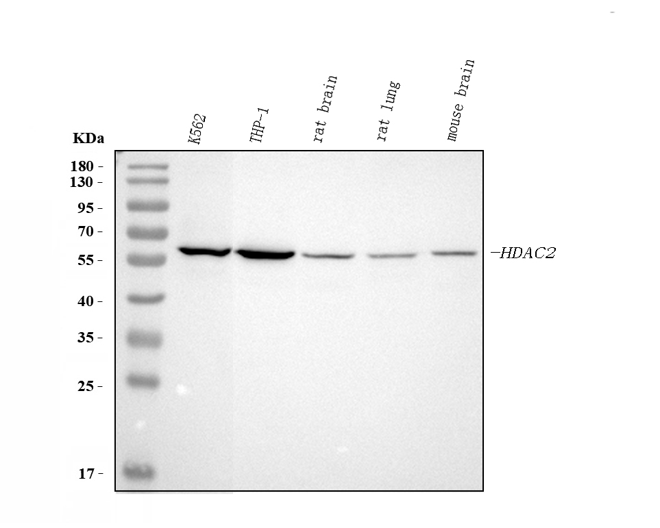 Western blot analysis of HDAC2 using anti-HDAC2 antibody (A00325-3). The sample well of each lane was loaded with 30 ug of sample under reducing conditions.