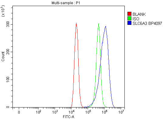 Overlay histogram showing THP-1 cells stained with A00369-3 (Blue line). To facilitate intracellular staining, cells were fixed with 4% paraformaldehyde and permeabilized with permeabilization buffer. The cells were blocked with 10% normal goat serum. And then incubated with rabbit anti-DAT/SLC6A3 Antibody (A00369-3) at 1:100 dilution for 30 min at 20°C. Fluoro488 conjugated goat anti-rabbit IgG (BA1127) was used as secondary antibody at 1:100 dilution for 30 minutes at 20°C. Isotype control antibody (Green line) was rabbit IgG at 1:100 dilution used under the same conditions. Unlabelled sample without incubation with primary antibody and secondary antibody (Red line) was used as a blank control.