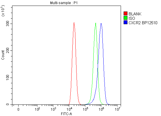 Overlay histogram showing THP-1 cells stained with A00455-3 (Blue line). To facilitate intracellular staining, cells were fixed with 4% paraformaldehyde and permeabilized with permeabilization buffer. The cells were blocked with 10% normal goat serum. And then incubated with rabbit anti-CXCR2 Antibody (A00455-3) at 1:100 dilution for 30 min at 20°C. Fluoro488 conjugated goat anti-rabbit IgG (BA1127) was used as secondary antibody at 1:100 dilution for 30 minutes at 20°C. Isotype control antibody (Green line) was rabbit IgG at 1:100 dilution used under the same conditions. Unlabelled sample without incubation with primary antibody and secondary antibody (Red line) was used as a blank control.