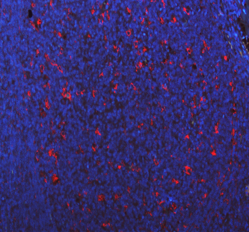 CD68 was detected in a paraffin-embedded section of human tonsil tissue. The tissue section was incubated with rabbit anti-CD68 Antibody (A00602-1) at a dilution of 1:100. Cy3-conjugated Anti-rabbit IgG Secondary Antibody (red) (Catalog # BA1032) was used as secondary antibody. The section was counterstained with DAPI (Catalog # AR1176) (Blue).
