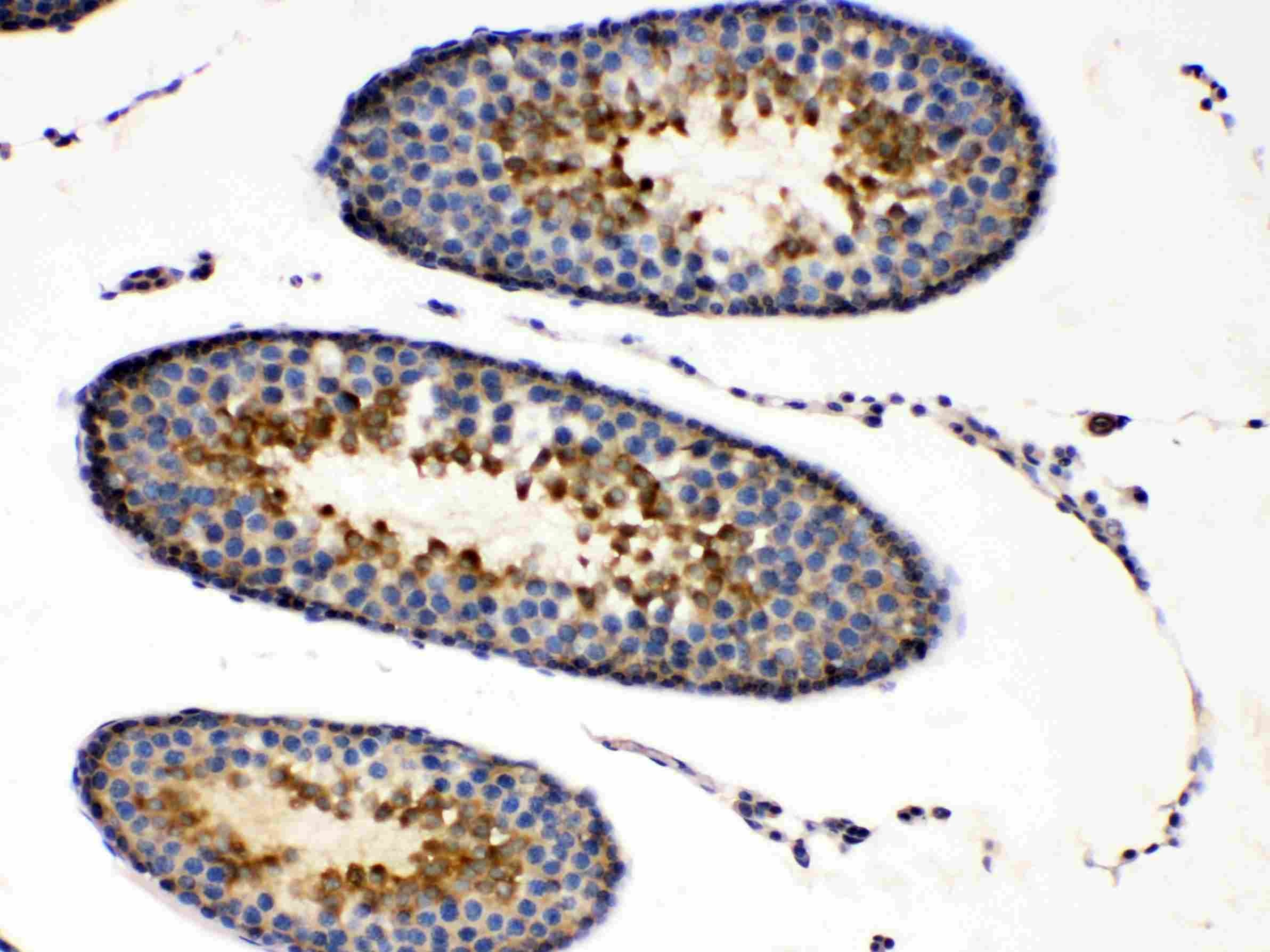 PRKAR1A was detected in a paraffin-embedded section of rat testis tissue. Biotinylated goat anti-rabbit IgG was used as secondary antibody. The tissue section was incubated with rabbit anti-PRKAR1A Antibody (A00699-1) at a dilution of 1:200 and developed using Strepavidin-Biotin-Complex (SABC) (Catalog # SA1022) with DAB (Catalog # AR1027) as the chromogen.