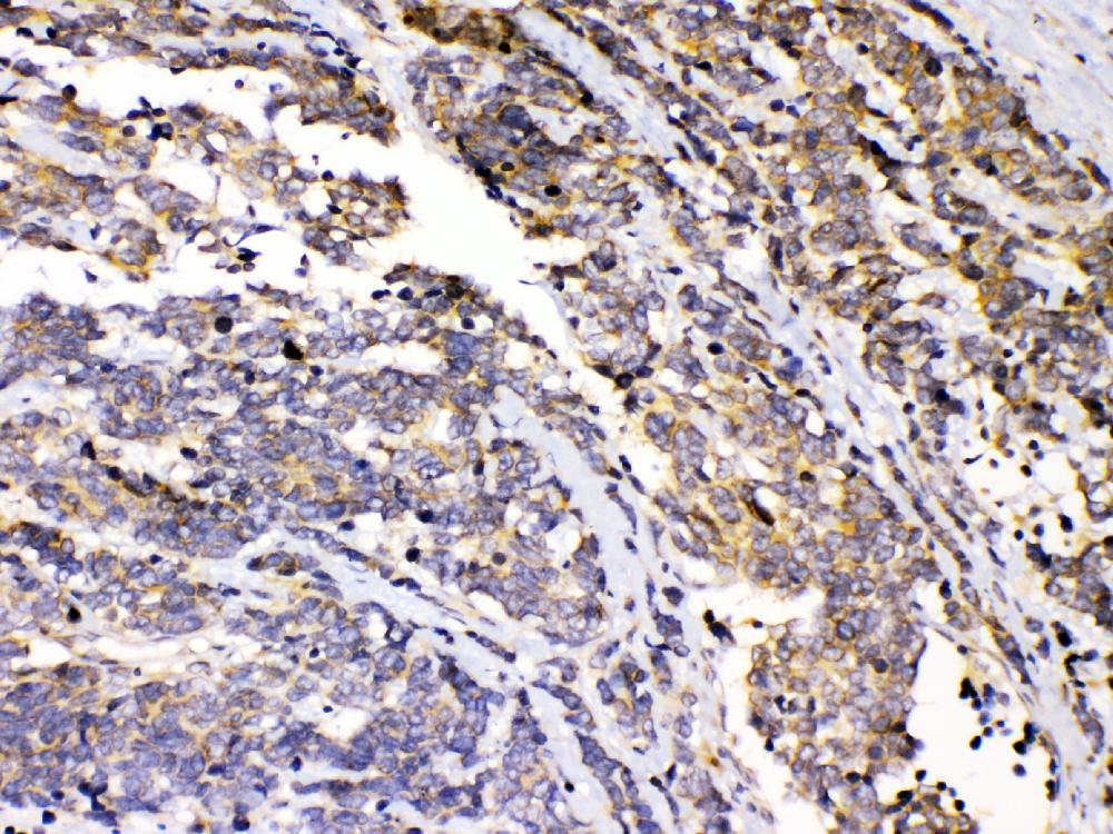 PRKAR1A was detected in a paraffin-embedded section of human intestinal cancer tissue. Biotinylated goat anti-rabbit IgG was used as secondary antibody. The tissue section was incubated with rabbit anti-PRKAR1A Antibody (A00699-1) at a dilution of 1:200 and developed using Strepavidin-Biotin-Complex (SABC) (Catalog # SA1022) with DAB (Catalog # AR1027) as the chromogen.