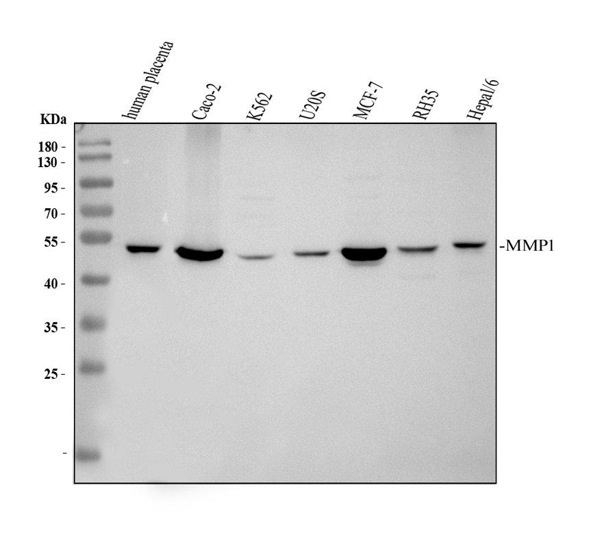 After electrophoresis, proteins were transferred to a membrane. Then the membrane was incubated with rabbit anti-MMP1 antigen affinity purified polyclonal antibody (A00733-1) at a dilution of 1:1000 and probed with a goat anti-rabbit IgG-HRP secondary antibody (Catalog # BA1054). The signal is developed using ECL Plus Western Blotting Substrate (Catalog # AR1197). A specific band was detected for MMP1 at approximately 54 kDa. The expected band size for MMP1 is at 54 kDa.