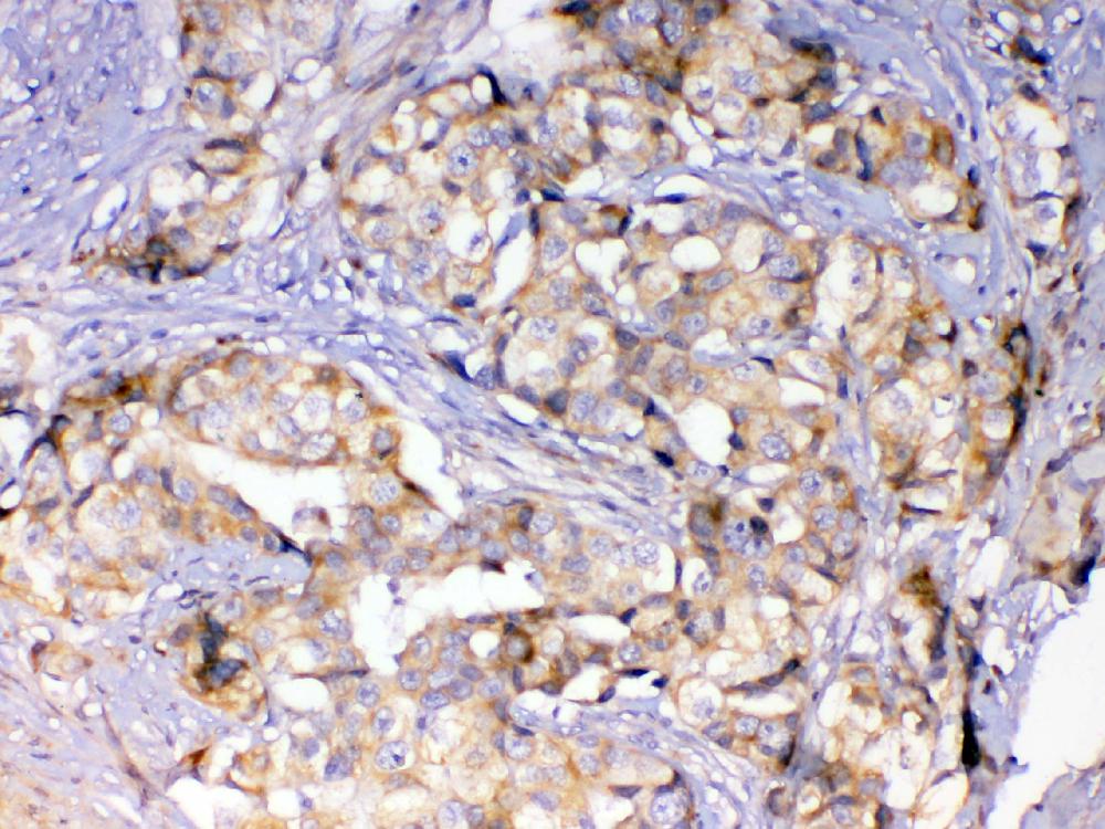 ASL was detected in a paraffin-embedded section of human mammary cancer tissue. Biotinylated goat anti-rabbit IgG was used as secondary antibody. The tissue section was incubated with rabbit anti-ASL Antibody (A00742-1) at a dilution of 1:200 and developed using Strepavidin-Biotin-Complex (SABC) (Catalog # SA1022) with DAB (Catalog # AR1027) as the chromogen.