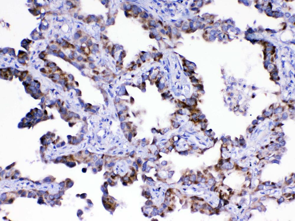 ASL was detected in a paraffin-embedded section of human lung cancer tissue. Biotinylated goat anti-rabbit IgG was used as secondary antibody. The tissue section was incubated with rabbit anti-ASL Antibody (A00742-1) at a dilution of 1:200 and developed using Strepavidin-Biotin-Complex (SABC) (Catalog # SA1022) with DAB (Catalog # AR1027) as the chromogen.
