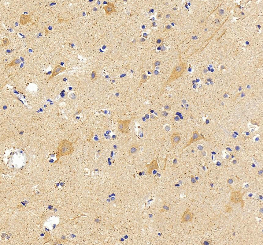 GSK3B was detected in a paraffin-embedded section of human brain tissue. The tissue section was incubated with rabbit anti-GSK3B Antibody (A00791-3) at a dilution of 1:200 and developed using HRP Conjugated Rabbit IgG Super Vision Assay Kit (Catalog # SV0002) with DAB (Catalog # AR1027) as the chromogen.