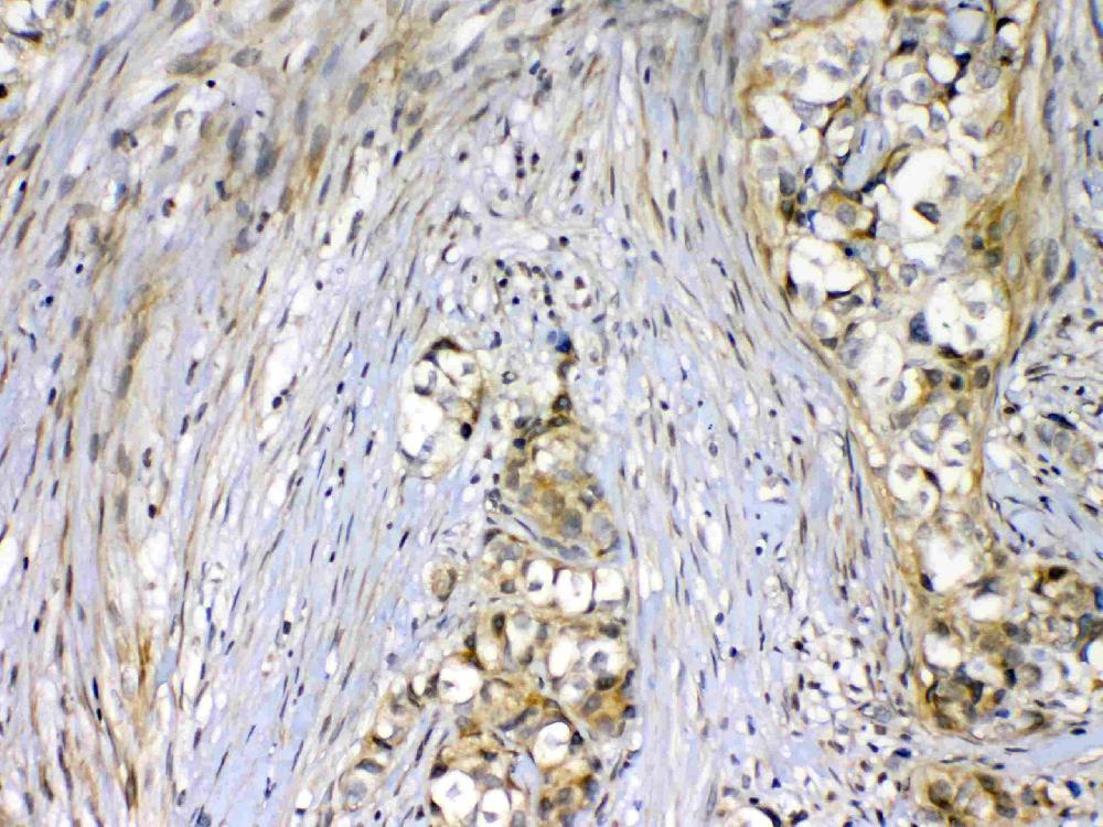 VEGFR2/KDR was detected in a paraffin-embedded section of human mammary cancer tissue. Biotinylated goat anti-rabbit IgG was used as secondary antibody. The tissue section was incubated with rabbit anti-VEGFR2/KDR Antibody (A00901-2) at a dilution of 1:200 and developed using Strepavidin-Biotin-Complex (SABC) (Catalog # SA1022) with DAB (Catalog # AR1027) as the chromogen.