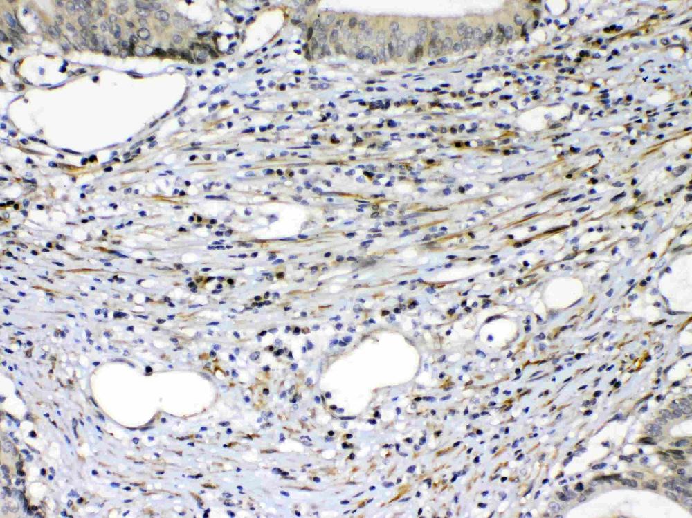 VEGFR2/KDR was detected in a paraffin-embedded section of human intestinal cancer tissue. Biotinylated goat anti-rabbit IgG was used as secondary antibody. The tissue section was incubated with rabbit anti-VEGFR2/KDR Antibody (A00901-2) at a dilution of 1:200 and developed using Strepavidin-Biotin-Complex (SABC) (Catalog # SA1022) with DAB (Catalog # AR1027) as the chromogen.