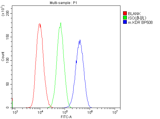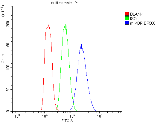 Overlay histogram showing LLC cells stained with A00901-3 (Blue line). To facilitate intracellular staining, cells were fixed with 4% paraformaldehyde and permeabilized with permeabilization buffer. The cells were blocked with 10% normal goat serum. And then incubated with rabbit anti-VEGFR2/KDR Antibody (A00901-3) at 1:100 dilution for 30 min at 20°C. Fluoro488 conjugated goat anti-rabbit IgG (BA1127) was used as secondary antibody at 1:100 dilution for 30 minutes at 20°C. Isotype control antibody (Green line) was rabbit IgG at 1:100 dilution used under the same conditions. Unlabelled sample without incubation with primary antibody and secondary antibody (Red line) was used as a blank control.