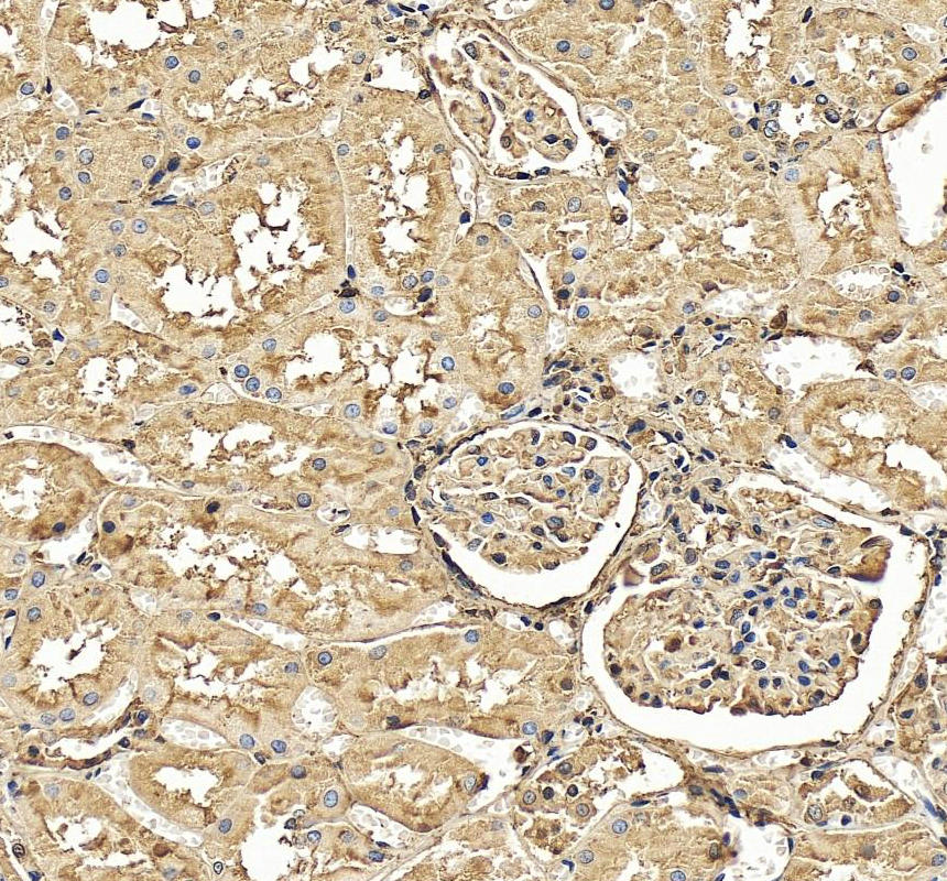 Cystatin C/CST3 was detected in a paraffin-embedded section of human kidney tissue. The tissue section was incubated with rabbit anti-Cystatin C/CST3 Antibody (A00961-2) at a dilution of 1:200 and developed using HRP Conjugated Rabbit IgG Super Vision Assay Kit (Catalog # SV0002) with DAB (Catalog # AR1027) as the chromogen.