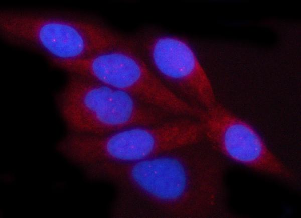 Porin/VDAC1 was detected in an immunocytochemical section of Hela cells. Cy3-conjugated Anti-rabbit IgG Secondary Antibody (red)(Catalog#BA1032) was used as secondary antibody. The section was counterstained with DAPI (Catalog # AR1176) (Blue).