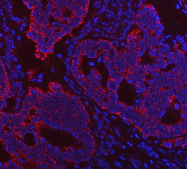 Porin/VDAC1 was detected in a paraffin-embedded section of human intestinal cancer tissue. Cy3-conjugated Anti-rabbit IgG Secondary Antibody (red)(Catalog#BA1032) was used as secondary antibody. The section was counterstained with DAPI (Catalog # AR1176) (Blue).