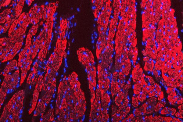 Porin/VDAC1 was detected in a paraffin-embedded section of mouse cardiac muscle tissue. Cy3-conjugated Anti-rabbit IgG Secondary Antibody (red)(Catalog#BA1032) was used as secondary antibody. The section was counterstained with DAPI (Catalog # AR1176) (Blue).