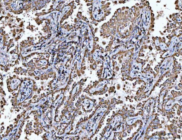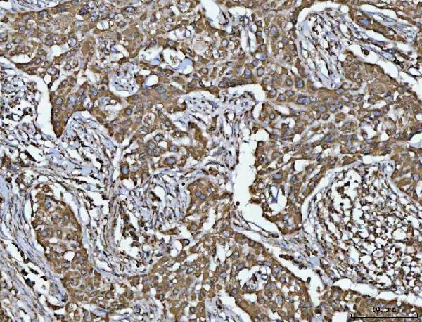 Porin/VDAC1 was detected in a paraffin-embedded section of human lung cancer tissue. The tissue section was developed using HRP Conjugated Rabbit IgG Super Vision Assay Kit (Catalog # SV0002) with DAB (Catalog # AR1027) as the chromogen.