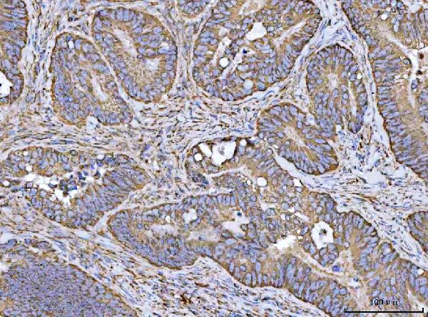 Porin/VDAC1 was detected in a paraffin-embedded section of human colorectal adenocarcinoma tissue. The tissue section was developed using HRP Conjugated Rabbit IgG Super Vision Assay Kit (Catalog # SV0002) with DAB (Catalog # AR1027) as the chromogen.